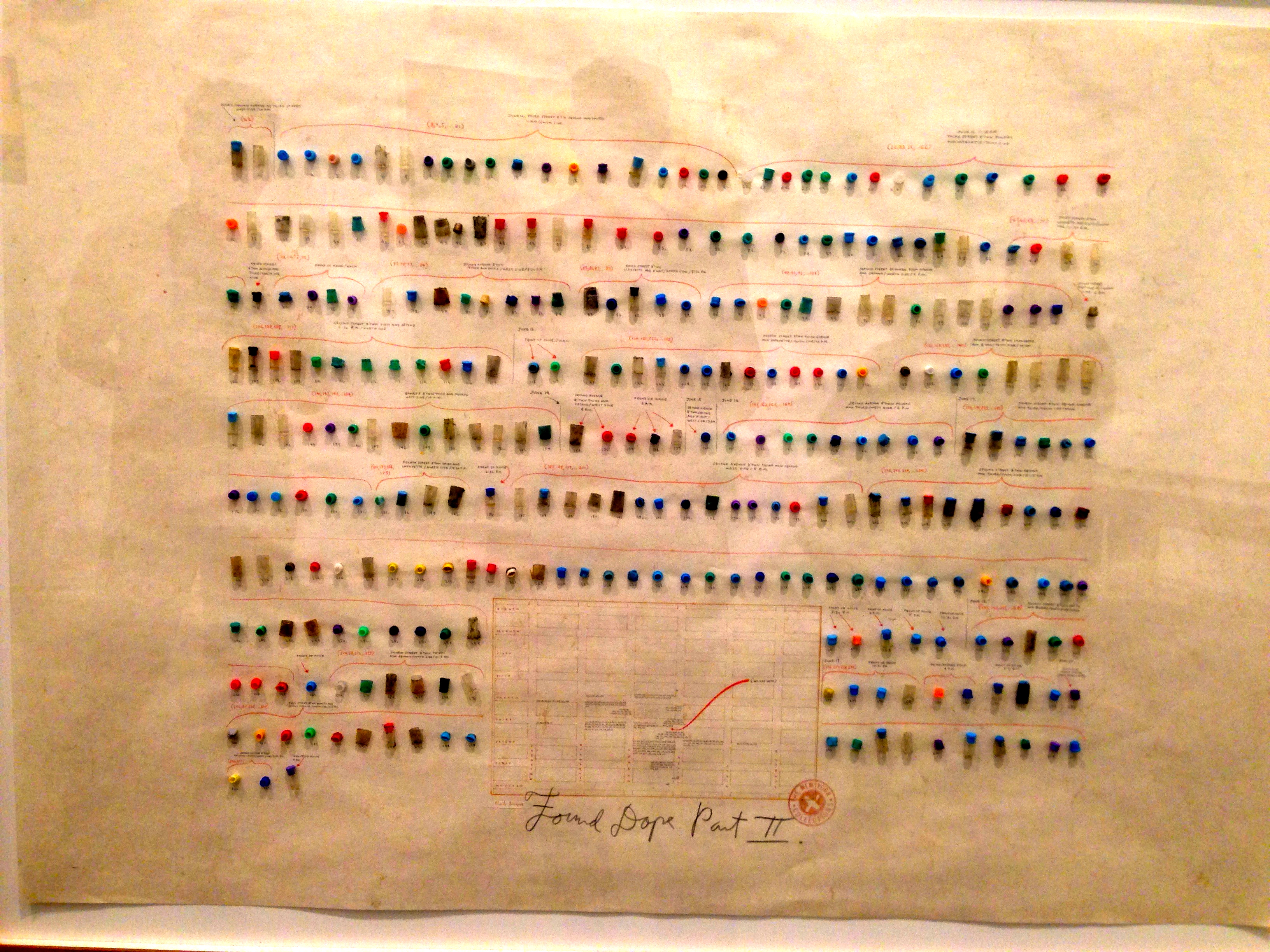 Found Dope Part II carefully records the chronology, type, and location of crack vials that littered Jernigan’s East Village neighborhood. Spanning some 16 days and covering a three block radius, she cataloged hundreds of crack vials and tops (308 to be exact), many in neon colors that were popular during that period (designer Stephen Sprouse’s Day-glo inspired fashion from the era comes to mind).