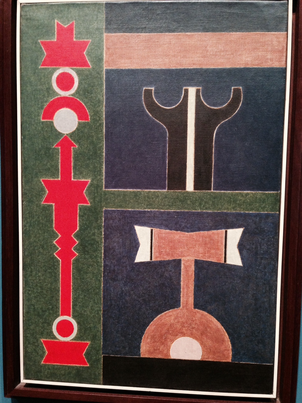 Ruben Valentim’s Painting 1 also evokes the religious rituals of Brazil’s indigenous culture and African cultural roots. Valentim places tribal elements into a sophisticated geometric composition to represent three deities (Orixás) of the Afro-Brazilian Candomblé religion.